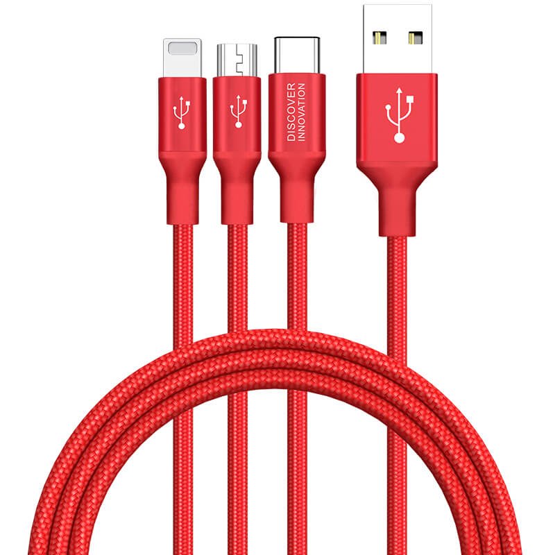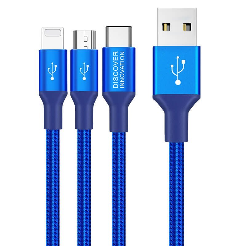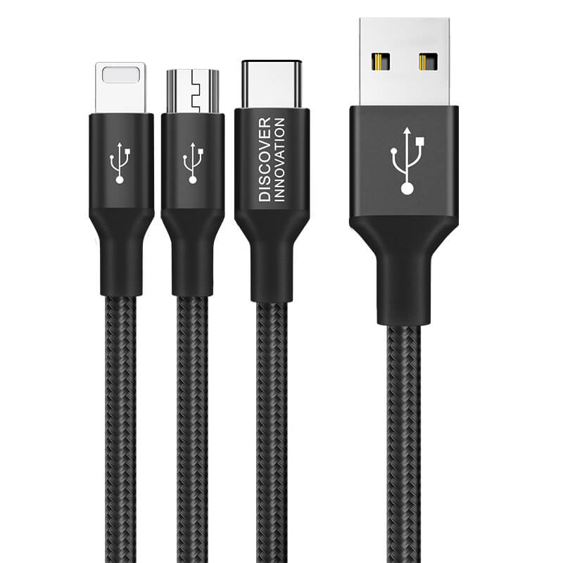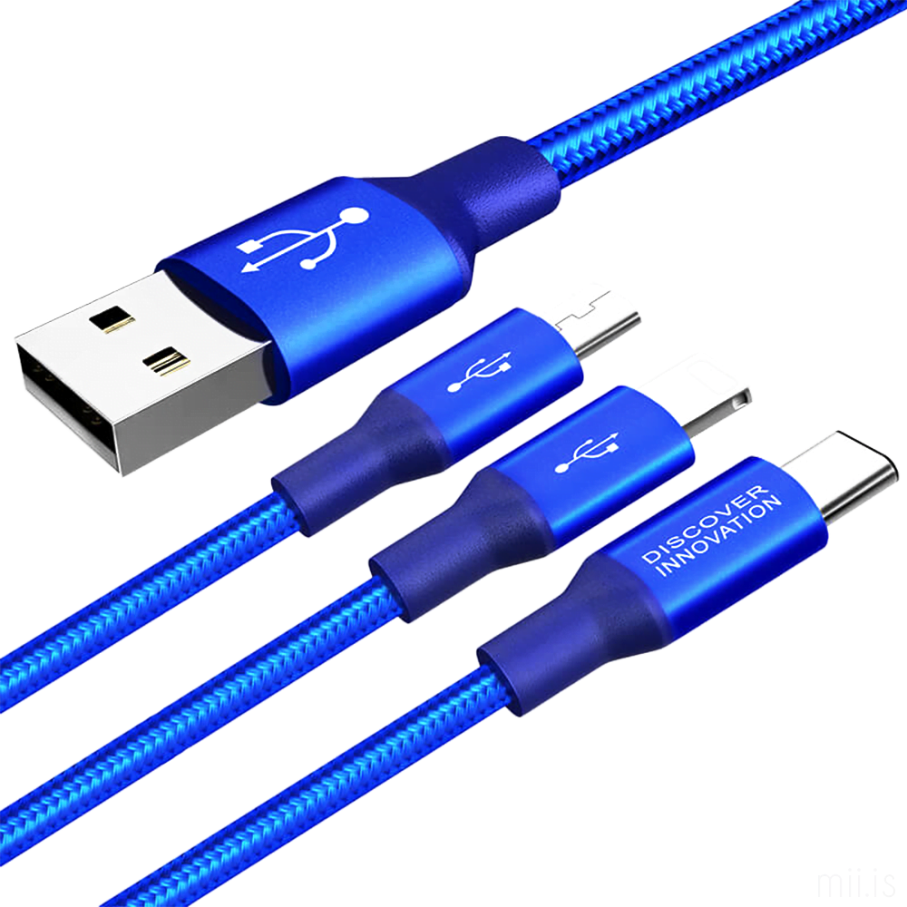 1.5m gagna- og hleðslukapall frá Nillkin með venjulegu USB-A á einum endanum og hinn endirinn skiptist niður í þrjú tengi, micro-USB + USB-C + Lightning. Snúran er sterkbyggð og vafin með kevlar. Þægileg og fjölnota snúra sem getur hlaðið allt að þrjú tæki í einu!