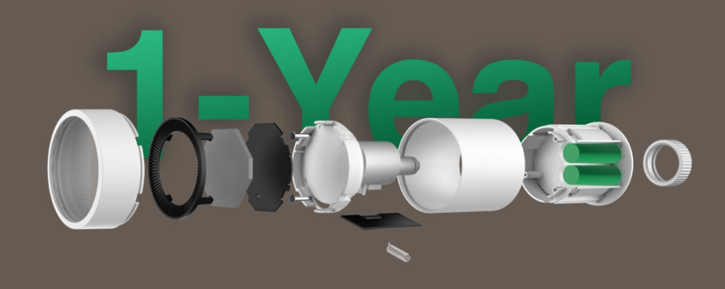 Þökk sé sparsama Zigbee 3.0 staðlinum dugar rafhlaðan á ofnstillinum í allt að 1. ár. Þegar komið er að því er einfalt að skipta um 2x AA rafhlöður.
