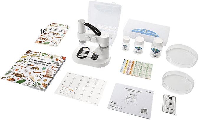 Smásjáin kemur með aragrúa af aukahlutum til að koma okkur í rétt hlutverk. Það fylgir handbók, upplýsingabók og nótubók til að við getum lært á tækið og nótað niður hvað við höfum lært og séð. Einnig fylgir með settinu sýnabox, glös, tangir, dropateljari, sýnagler og margt fleira, allt sem þarf til að hefja leiðangurinn í átt að meiri þekkingu.