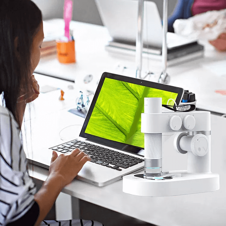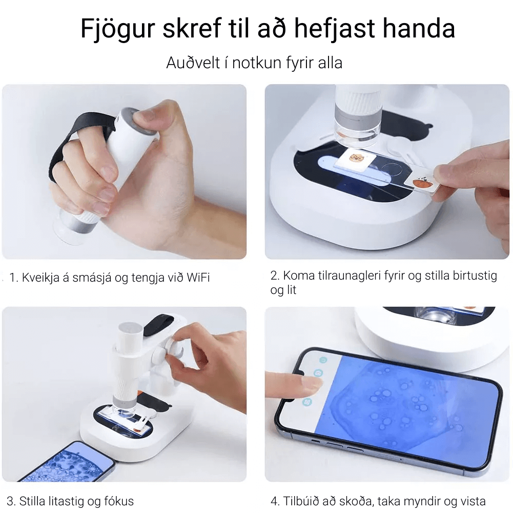 Smásjáin er ekki eins og við þekkjum þær frá skól- eða tilraunastofum. Í staðinn fyrir að gægjast í gegnum sjálft tækið og sjá aðeins með öðru auganu tengist smásjáin með WiFi við alla skjái sem það styðja. Þá geta fleiri skoðað í einu, á þægilegri máta.