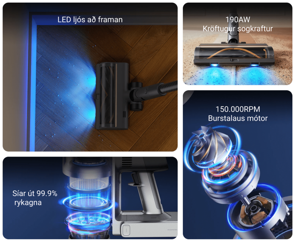 Einstaklega kröftug handryksuga sem aðlagar sogkraft eftir þörf og er með bláum LED ljósum að framan
