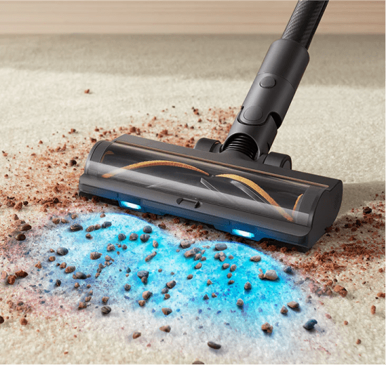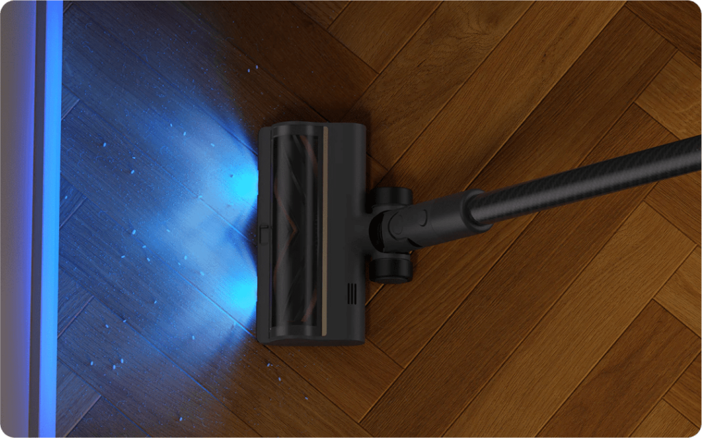 Aðalburstinn á R20 er með innbyggðu bláu LED ljósi sem að hjálpar mikið til við að sjá óhreinindi á gólfinu sem annars gætu hafa farið framhjá okkur, hvort sem það er á miðju gólfinu eða á dimmari svæðum eins og undir sófa eða bakvið skápinn.