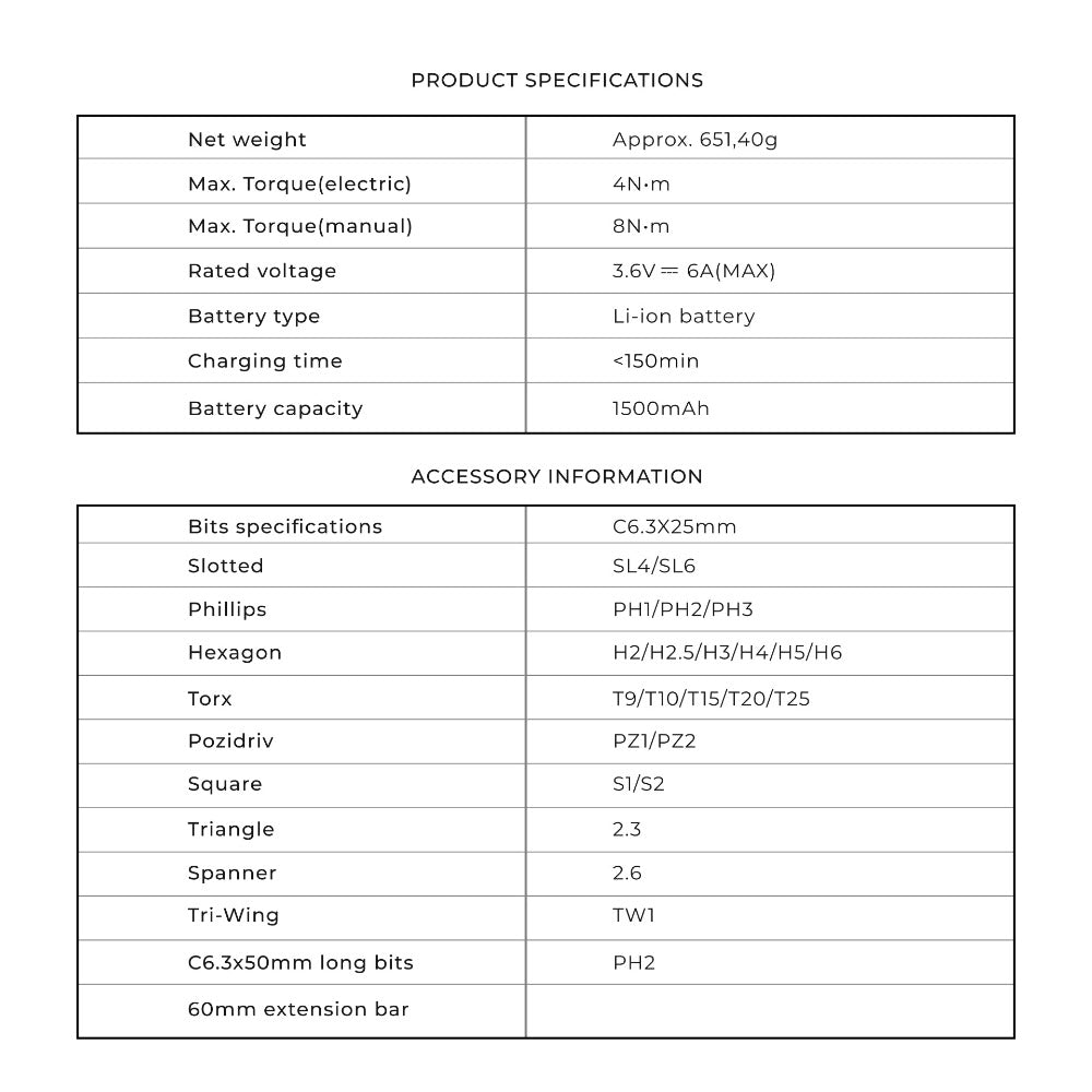 HOTO rafmangsskrúfjárnið er einstaklega þægilegt í notkun og hentar vel á öll heimili. Skrúfjárnið kemur í boxi sem geymir skrúfjárnið og bitana, er endurhlaðanlegt með USB-C, dugar í langan tíma á einni hleðslu, er með tvær togstillingar og kemur með öllum helstu bitunum svo að engin skrúfa getur falið sig.
