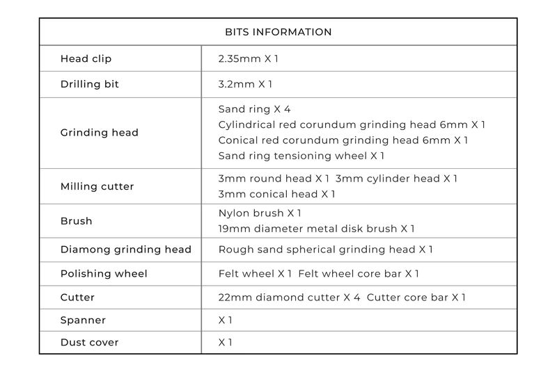 Með HOTO fræsaranum koma 35 fylgihlutir, hægt er að sjá lista af þeim hér fyrir neðan.