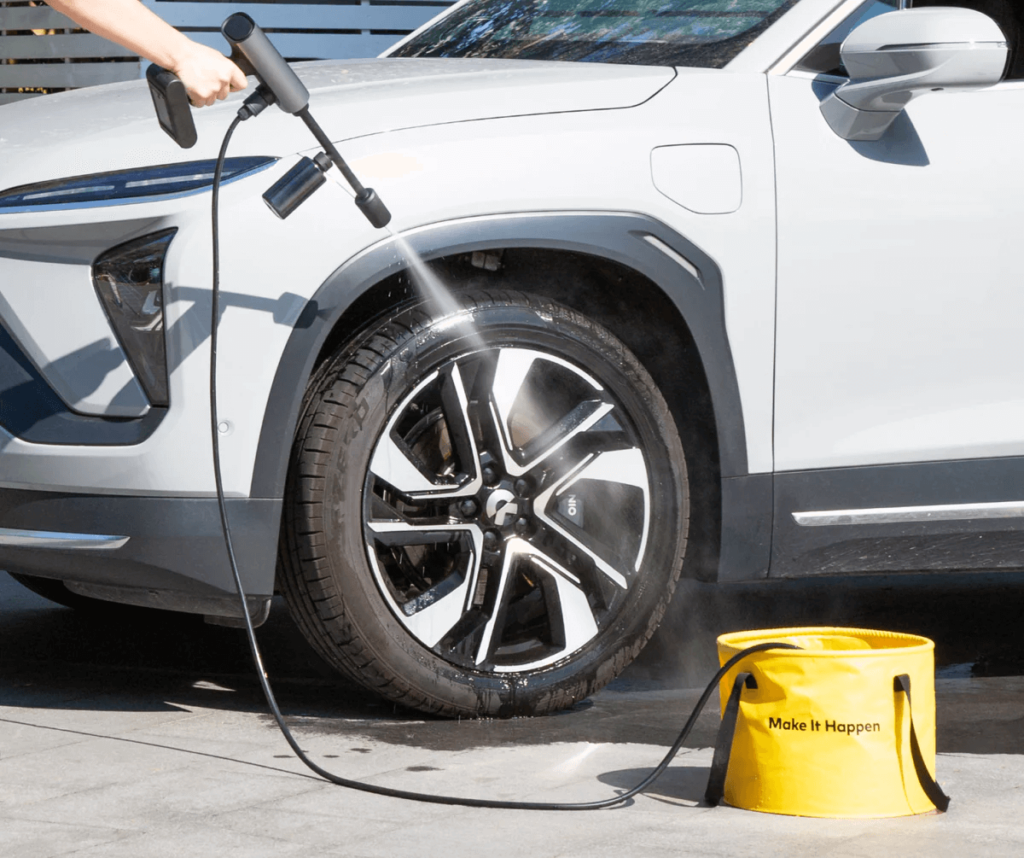 Vatnsslöngunni úr háþrýstidælunni er hægt að klemma á hlið fötunnar og vera þá með einstaklega færanlega og stóra vatnsfötu fyrir þvottinn.