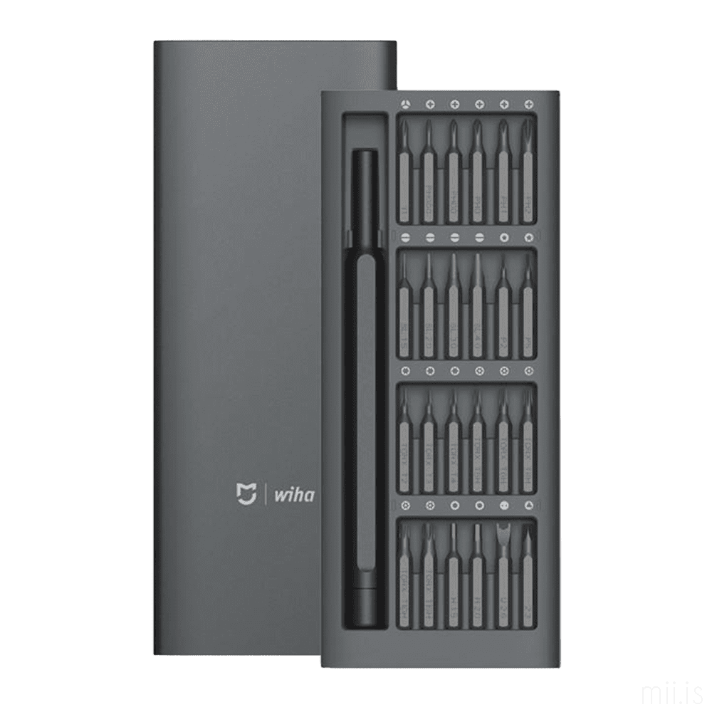 Skrúfjárnasett sem öll heimili ættu að eiga! Þetta skrúfjárnasett kemur í fallegum álboxi sem þægilegt er að ferðast með og passar á sama tíma að allir skrúfjárnabitarnir séu saman á einum og öruggum stað. Hentar fyrir flest öll heimilstæki svo sem úr, myndavélar, sjónvörp, síma, tölvur og útvörp svo eitthvað sé nefnt. 24 skrúfjárnabitar fylgja með og eru þeir eftirfarandi: