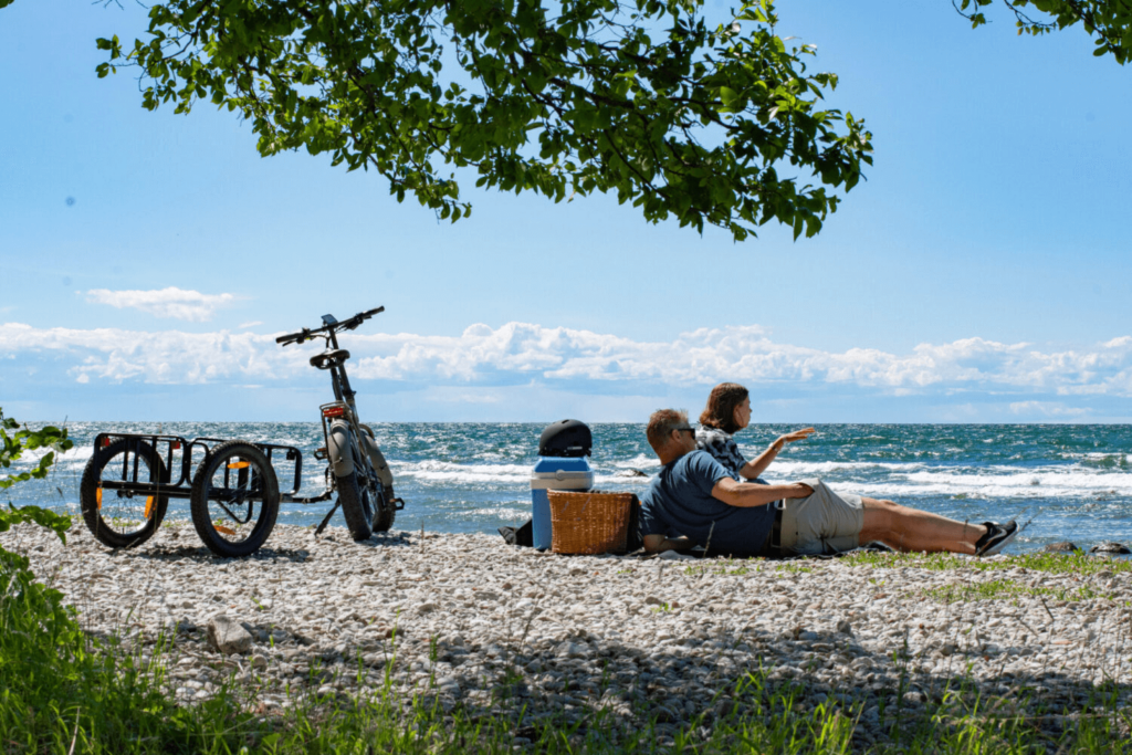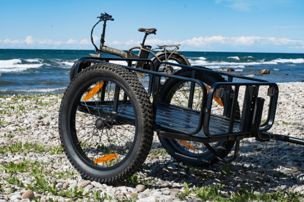 Fallegur matt svartur eftirvagn festist við afturfelgu á Rawbike rafmagnshjólin. Stöngin milli vagns og hjóls er viðsnúanleg þannig einnig er hægt að nota vagninn sem litla handdregna kerru.
