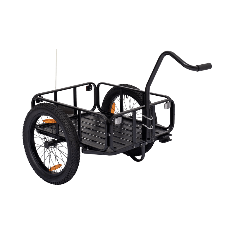 Fallegur matt svartur eftirvagn festist við afturfelgu á Rawbike rafmagnshjólin. Stöngin milli vagns og hjóls er viðsnúanleg þannig einnig er hægt að nota vagninn sem litla handdregna kerru.