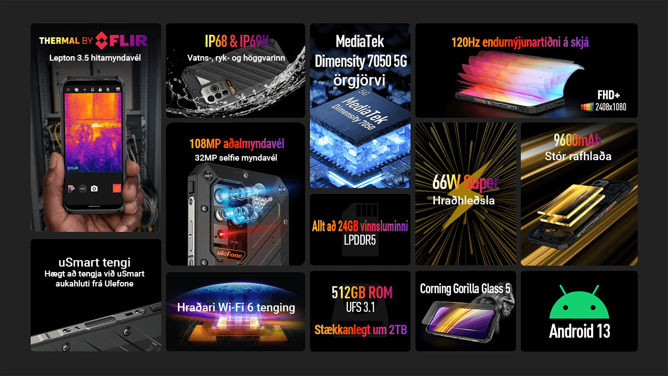 Ulefone Armor 18T Ultra er einn besti síminn frá Ulefone til þessa. Það sem einkennir 18T Ultra er FLIR hitamyndavél og stór rafhlaða. Með uSmart tenginu er hægt að tengja við aukabúnað eins og röramyndavél, næturmyndavél, o.s.frv.