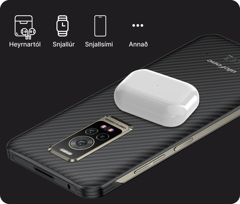 Ulefone Power Armor 18T Ultra styður þráðlausa hleðslu allt að 15W. Síminn er einnig með öfuga þráðlausa hleðslu sem þýðir að hann getur hlaðið önnur snjalltæki sem styðja þráðlausa hleðslu með því að leggja þau á bakhlið símans. Fullkomið til að hlaða heyrnartól, snjallúr eða aðra snjallsíma sem þurfa smá auka hleðslu.