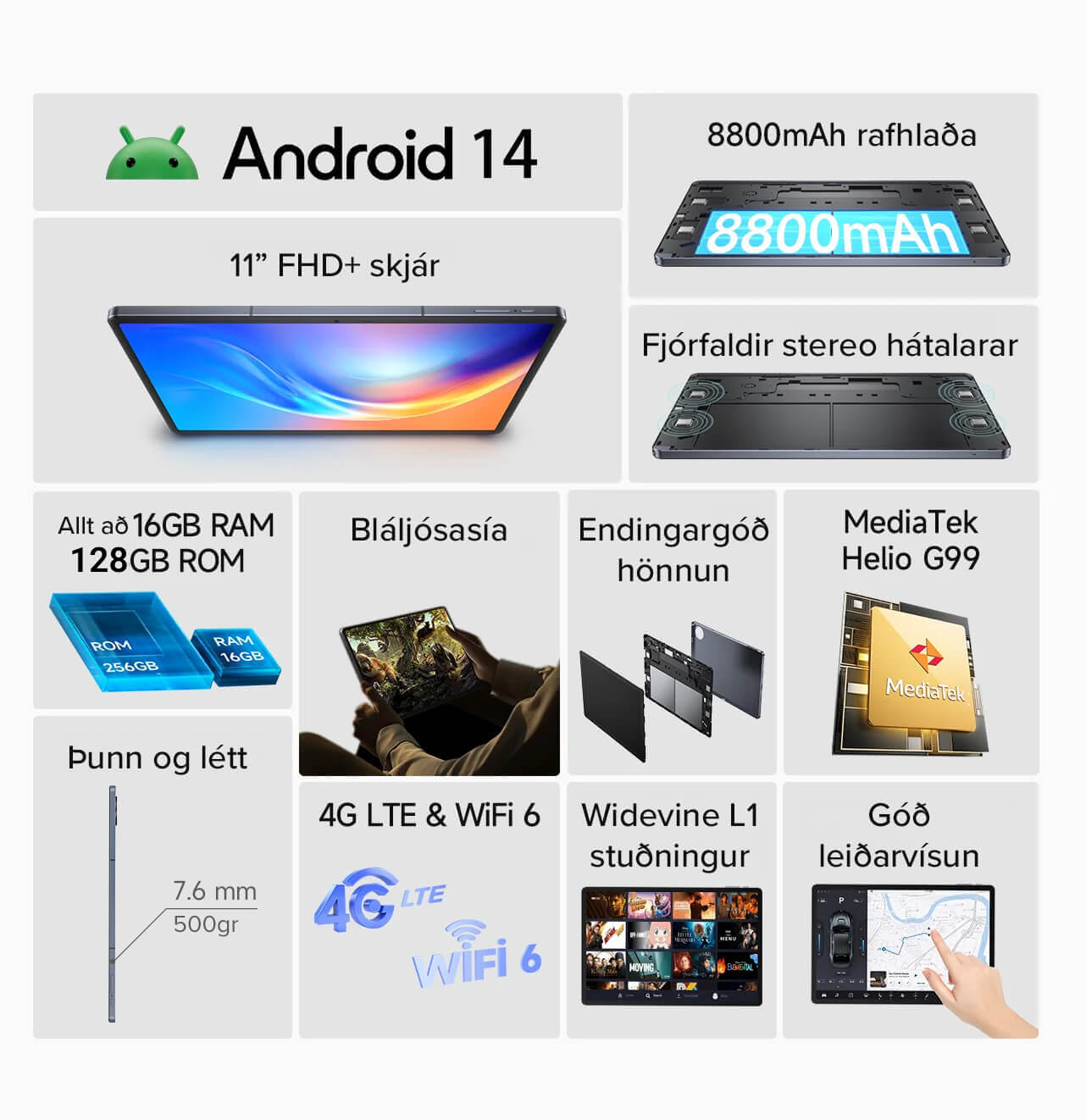 Ulefone Tab A11 Pro spjaldtölvan er þrátt fyrir að vera 11″ að stærð einungis 500.5gr og 7.6mm að þykkt. Skjárinn er stór og nær vel útí alla kantana með FHD+ upplausn og 90Hz endurnýjunartíðni. Hægt er að tengja tölvuna við 4G farsímanetið þannig hægt er að nota hana hvar og hvenær sem er. Tölvan er með öflugan örgjörva, fjórfalda hátalara og 8+128GB geymslupláss.