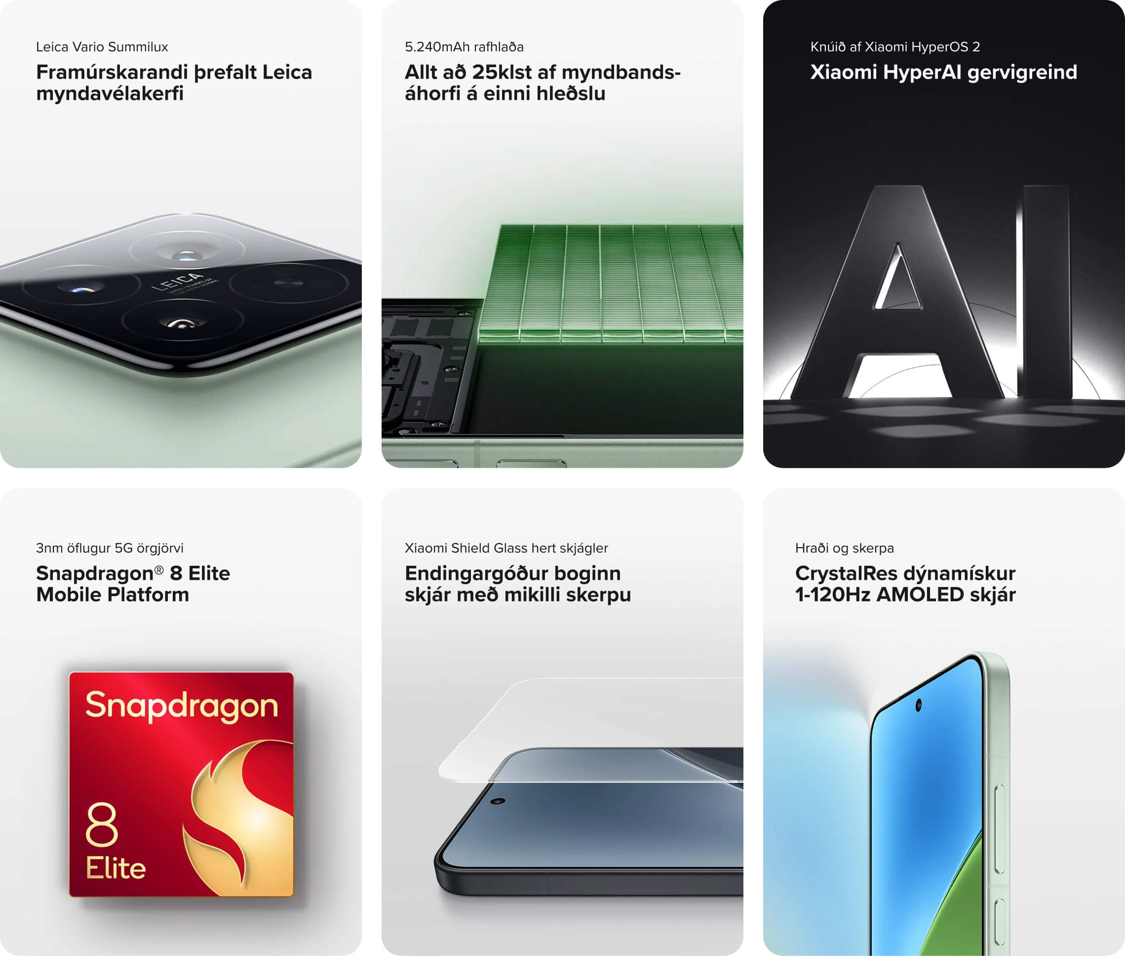 12+256GB | Þrefalt Leica myndavélakerfi | Snapdragon® 8 Elite örgjörvi | 6.36″ CrystalRes skjár | Góð rafhlöðuending | Xiaomi HyperOS 2 stýrikerfi | Innbyggð gervigreind