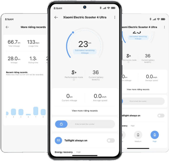 Skoðaðu upplýsingar um ferðirnar þínar, hversu marga kílómetra hjólið kemst áður en það verður batteríslaust og villumeldingar í Xiaomi Home appinu.