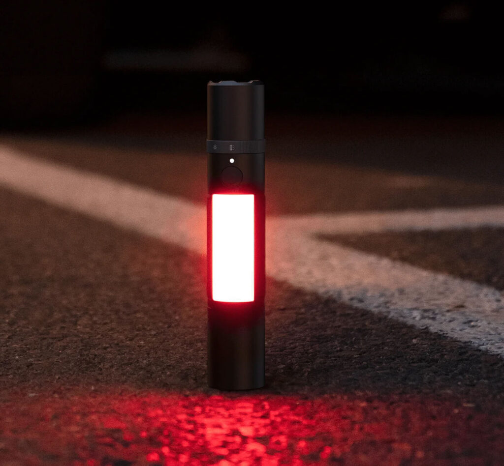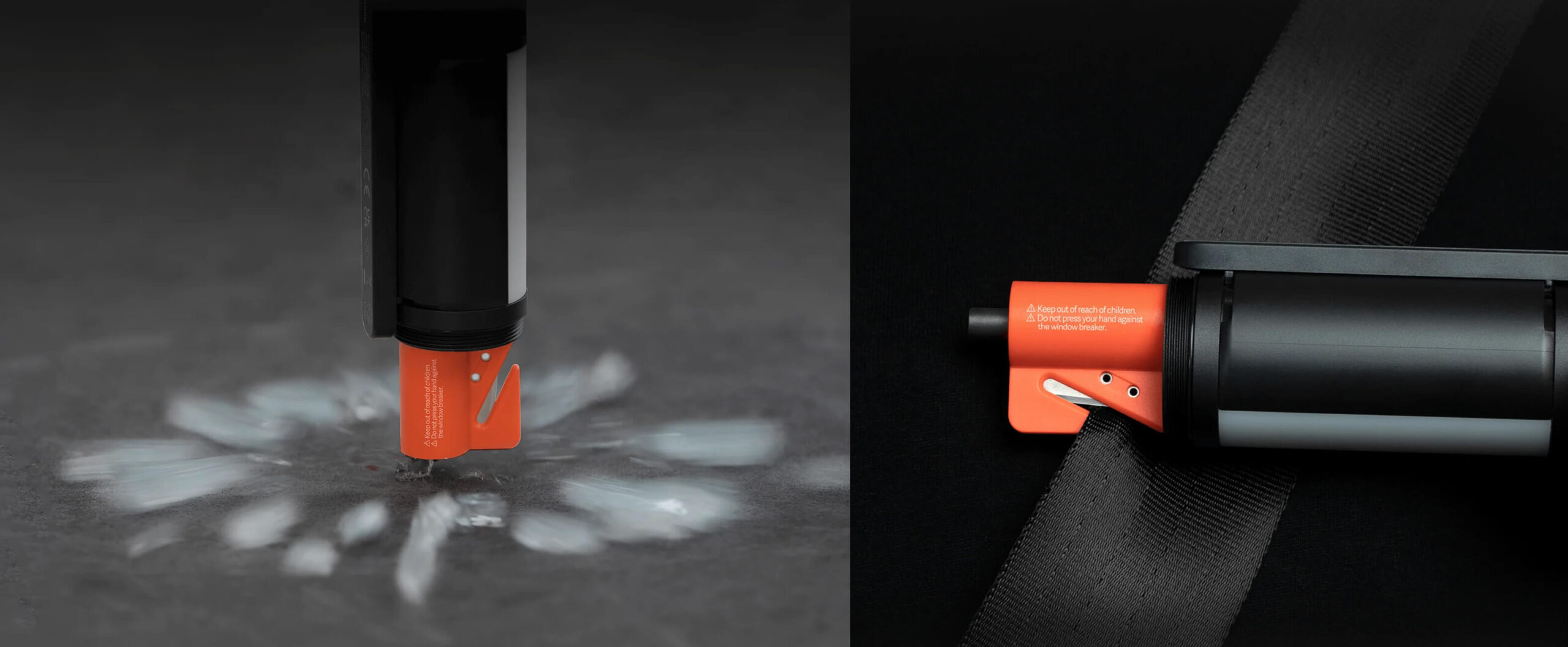 Á botni vasaljósins er bæði sætisbeltaskeri og rúðubrjótur. Sætisbeltaskerinn virkar best á 45° horni og blaðið er vel varið fyrir öruggri notkun. Til þess að nota rúðubrjótinn þarf einfaldlega að leggja botninn á vasaljósinu við glerið og ýta.