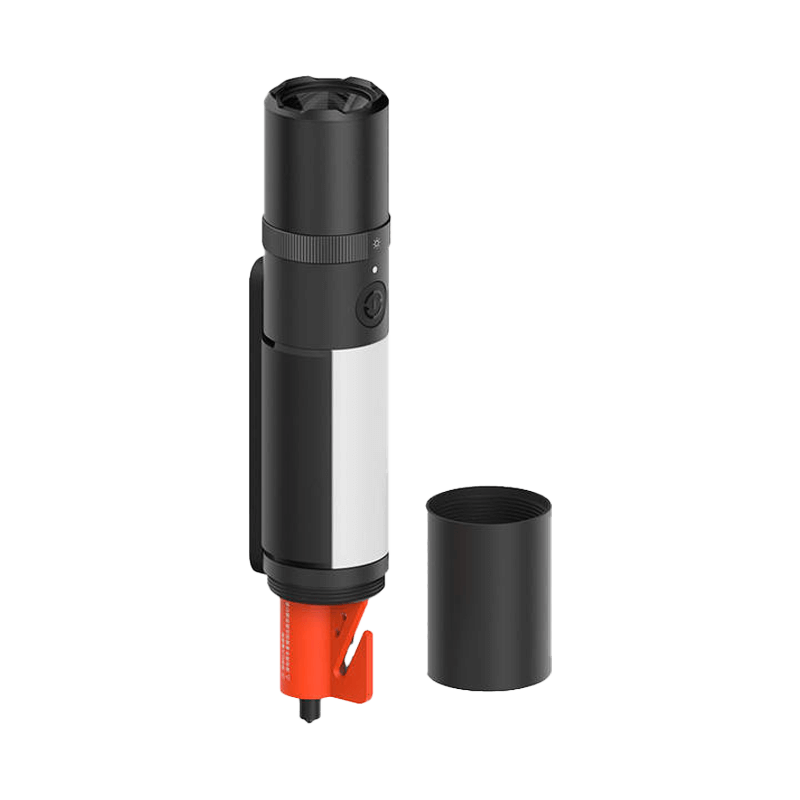 Á botni vasaljósins er bæði sætisbeltaskeri og rúðubrjótur. Sætisbeltaskerinn virkar best á 45° horni og blaðið er vel varið fyrir öruggri notkun. Til þess að nota rúðubrjótinn þarf einfaldlega að leggja botninn á vasaljósinu við glerið og ýta.