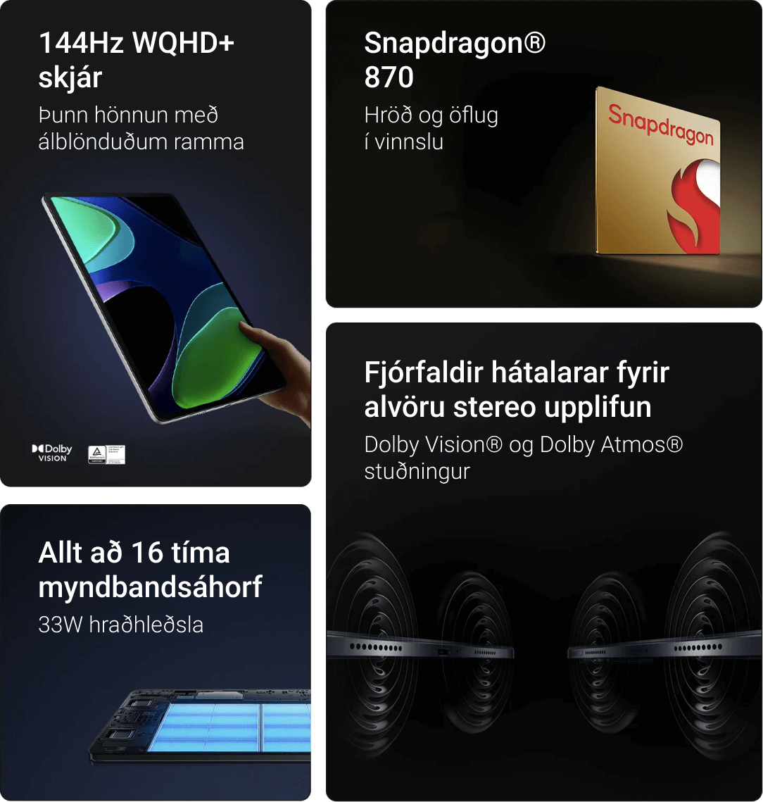 Flaggskipsörgjörvinn Snapdragon® 870 tryggir það að Xiaomi Pad 6 spjaldtölvan er tilbúin í alla vinnslu. Spjaldtölvan er vel í stakk búin til að takast á við krefjandi forrit, skipta á milli margra forrita, spila tölvuleiki og jafnvel vinna í 4K myndböndum.