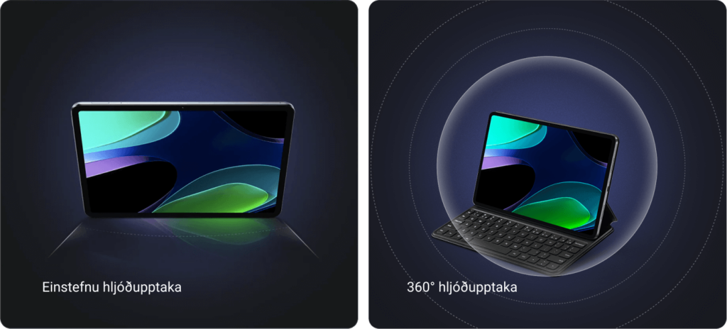 Xiaomi Pad 6 er með míkrófóna sem geta tekið upp hljóð eftir því hvað hentar best hverju sinni. Hægt er að taka upp hljóð 60° fyrir framan tölvuna sem hentar þegar fáir eru á fundi og síðan er hægt að taka upp hljóð í 360° sem er frábært þegar margir eru á fundinum. Hægt er að kveikja á sérstakri stillingu sem minnkar hljóð frá umhverfinu.
