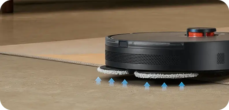 Moppurnar lyftast upp þegar vélin skynjar mottur til þess að koma í veg fyrir að motturnar blotna. Ef það er stillt á Carpet Boost Mode þá fer hún strax að auka sogkraftinn til þess að ná ryki vel úr mottum.