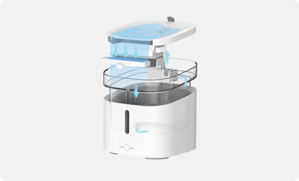 Þegar búið er að setja vatn í tankinn og kveikja á tækinu þá byrjar vatnið að fara í hringrásarhreyfingu, vatnið hreinsast í gegnum síu, fer í drykkjarskálina og svo aftur niður í tankinn. Þegar það þarf að fylla á vatnið eða þrífa vatnstankinn tekur maður í flipann og þá slökknar á tækinu sjálfkrafa.