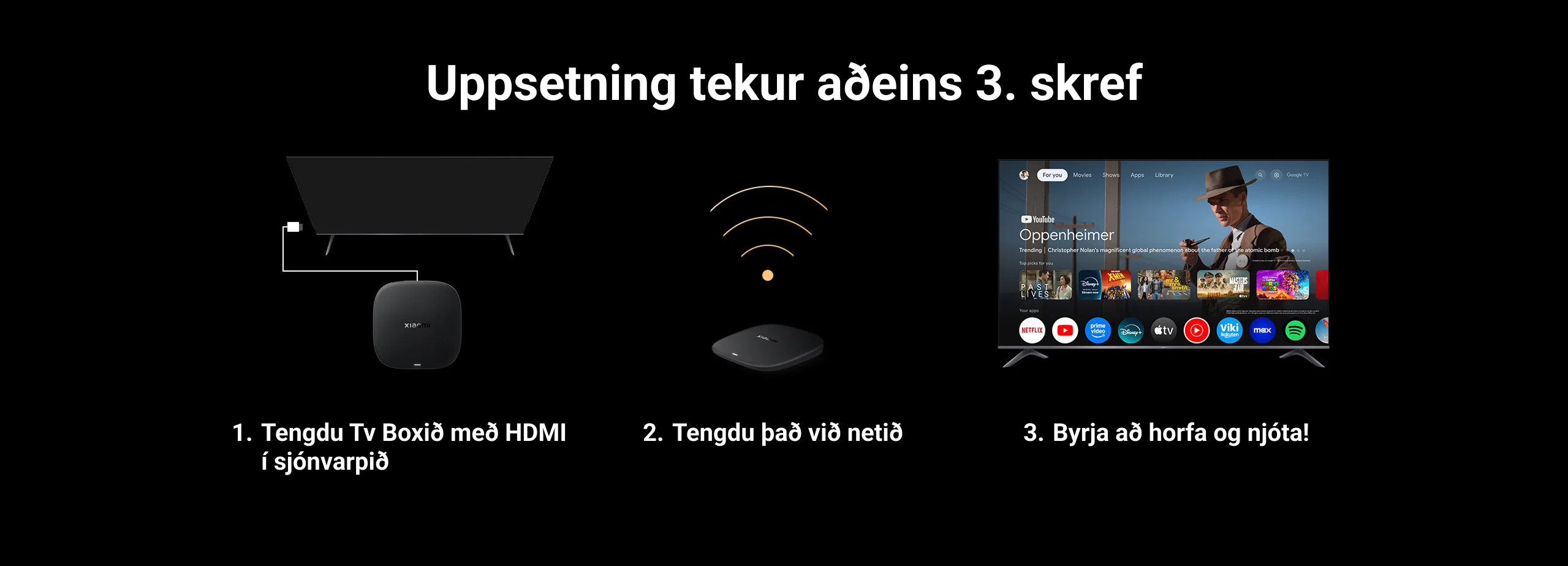 Google TV býður upp á yfir að hafa allar helstu streymisveitur. Netflix, Disney+, Sýn+, Sjónvarps símans, RÚV, Prime Video og þar á meðal yfir 10.000 öpp sem hægt er að sækja í gegnum Google Play Store.